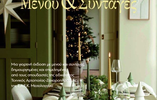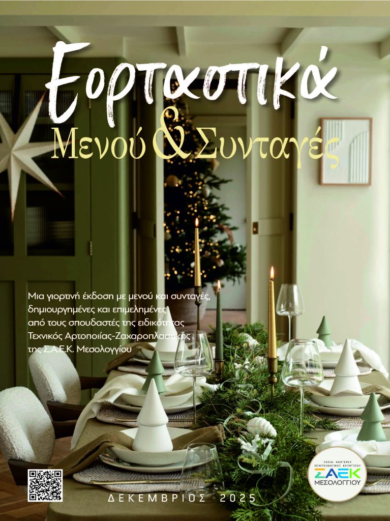 Η Σχολή Ανώτερης Επαγγελματικής Κατάρτισης (Σ.Α.Ε.Κ.) Μεσολογγίου παρουσιάζει με ιδιαίτερη χαρά το νέο γιορτινό φυλλάδιο “Εορταστικά Μενού & Συνταγές”, μια καλαίσθητη και εμπνευσμένη έκδοση που δημιουργήθηκε από τους σπουδαστές της ειδικότητας…