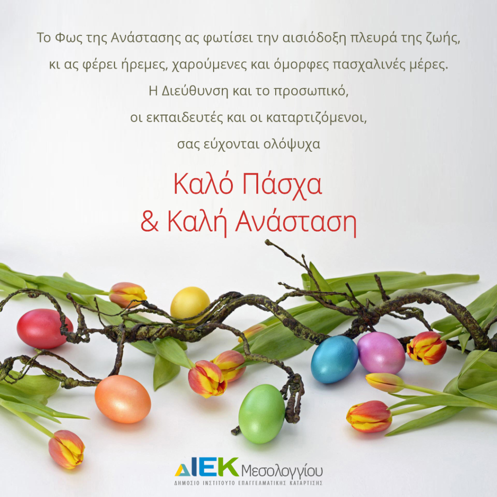 Το Φως της Ανάστασης ας φωτίσει την αισιόδοξη πλευρά της ζωής. Θερμές ευχές για ήρεμες, όμορφες και χαρούμενες πασχαλιάτικες μέρες. Καλή Ανάσταση και καλό Πάσχα!