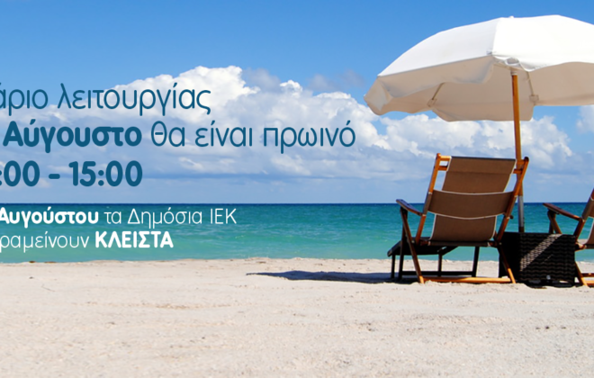 Όπως προβλέπεται στον Κανονισμό λειτουργίας των Ι.Ε.Κ., η λειτουργία των Δημοσίων ΙΕΚ για τους μήνες Ιούλιο και Αύγουστο θα είναι πρωινή. Συγκεκριμένα, το ωράριο λειτουργίας από 1η Ιουλίου έως και 31 η…