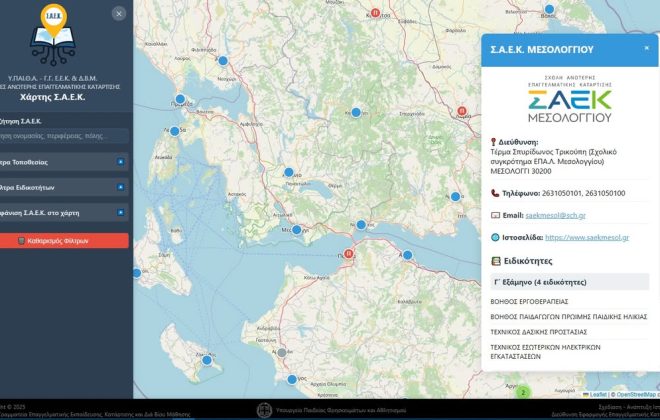 Η Γενική Γραμματεία Επαγγελματικής Εκπαίδευσης, Κατάρτισης και Δια Βίου Μάθησης, ανακοινώνει τη δημιουργία του Διαδραστικού Χάρτη των Σχολών Ανώτερης Επαγγελματικής Κατάρτισης (Σ.Α.Ε.Κ.) αρμοδιότητάς της, σε όλη την Ελλάδα. Η νέα πλατφόρμα…